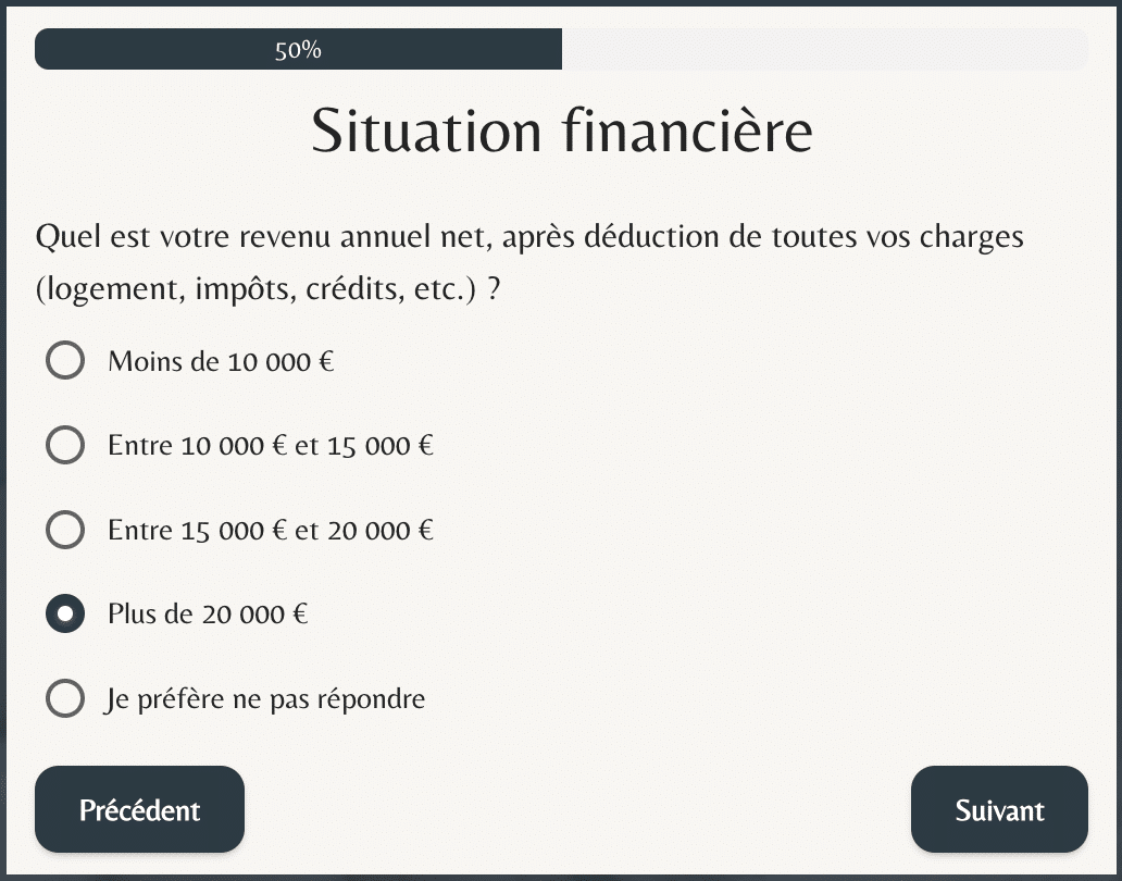 Chaque étape a été réfléchie pour réduire l’abandon, guider l’utilisateur, et garantir une collecte de données propre, exploitable, et structurée.